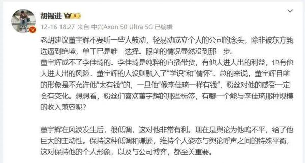 资深媒体人胡锡进则发布长文评论表示,董宇辉做不了“李佳琦”,董宇辉不应该听信其他人的鼓动成立个人公司,对他而言这不是“转型”而是充满风险的“再创业”。胡认为,董宇辉与东方甄选仍有合作空间,维持谦虚、宽容大度的形象也有利于为其赢得更多尊重和优质关注。