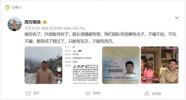 其中,“西方臻选”迅速找来一个外貌形似董宇辉的主播带货,一度吸引了超4万人在线观看,但随后遭到抖音封禁。西方臻选在社交媒体上表示,“不偷不抢、不坑不骗,都变成了罪过了,只能有东方,不能有西方”。同时其晒出了疑似遭到东方甄选投诉的截图。