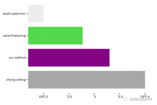 第一行是GPT-2的基准,最后一行是GPT-4的上限(基于RLHF),绿色是直接使用GPT-2生成的数据微调基座GPT-4之后GPT-4的性能,紫色是OpenAI改进了由弱到强的微调方法后GPT-4恢复的性能。