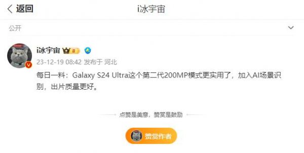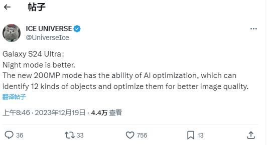 根据 @i 冰宇宙发布的推文内容,三星 Galaxy S24 Ultra 在升级第二代 2 亿像素主摄之后,能够识别 12 种拍摄主体,且具备更优秀的夜间成像能力。