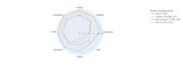 11月中旬,微软研究院机器学习团队的负责人Sebastien Bubeck在推特上发布了一张图,显示了在MT bench的测评体系下,仅有27亿参数规模的Phi-2得分6.62,18000亿参数的GPT-4得分8.99。