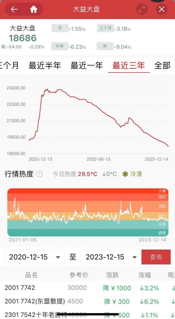 但随着大益茶的灵魂人物吴远之逝世、大益茶管控专营门店价格等系列措施,曾经被吴远之倾力打造“奢侈茶”的目标也逐渐混沌,接连两年,找找茶上大益茶的大盘指数连续下跌,跌幅超20%。一件茶一天能跌去上万元。