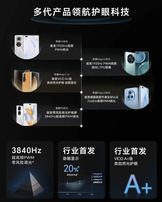 2019年荣耀V30实现电子书模式,荣耀30 Pro+成为业界首款支持1440Hz高频PWM调光产品;2021年荣耀50系列支持1920Hz PWM调光;2022年荣耀90系列首发3840Hz PWM调光,引领手机行业进入零风险调光时代。