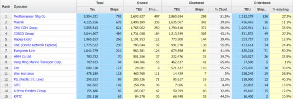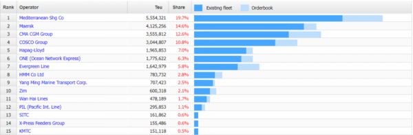 上图是集装箱班轮行业统计网站alphaliner的运力数据和排名,红色字体是运力占比。