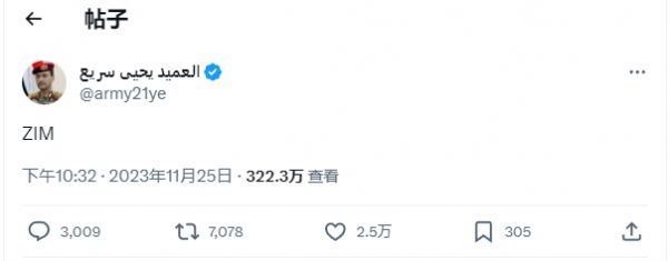 班轮公司中最受瞩目的应该是全球承运人中排名第十二位的以星航运(ZIM)。这是一家以色列政府控股,货真价实的是以色列的船公司。也是挂靠以色列港口最大的班轮公司。按说应该是首要打击目标。其实在11月末胡塞武装发言人叶海亚·萨里亚在社交媒体X(原推特)上发表一篇帖子,只写了“ZIM”一个单词。已经是公开点名了。