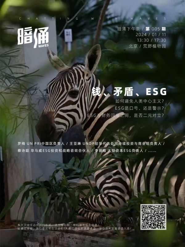 此外,基于此次调研,我们将在2024年1月中旬,举办「暗涌Waves·ESG主题沙龙」,邀请ESG领域官方机构、行业专家以及一级市场相关从业者,与我们一起讨论不止于以下话题(请扫描下面海报中二维码报名):
