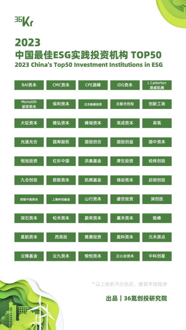 以下,是36氪 2023年度「中国最佳ESG实践投资机构TOP50」全名单: