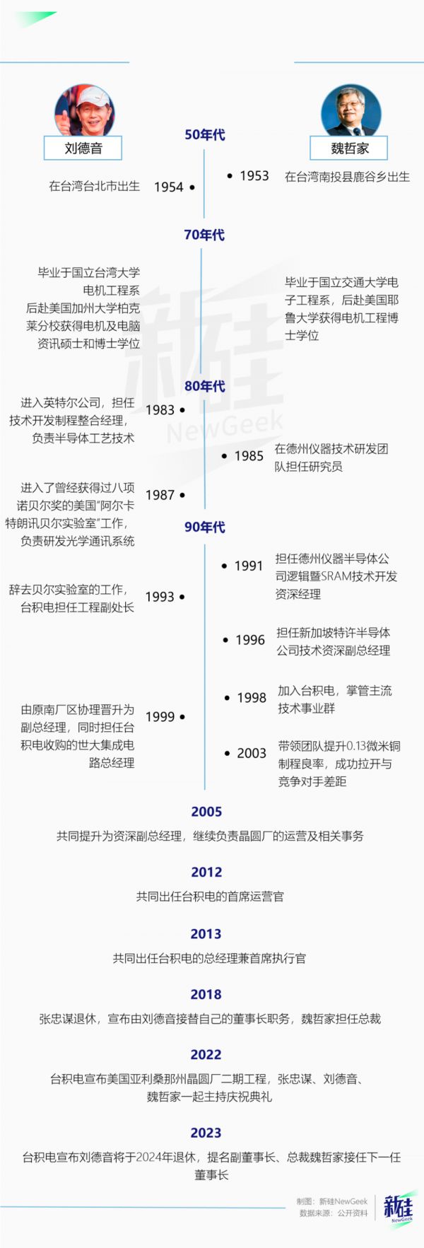 相比于张忠谋的故事都被写得包浆了,这两人各位硅友们可能没那么熟悉,简单了解这两人的关系——在2018年张忠谋退休后,刘德音升任董事长,魏哲家当上总裁,被称做是“双首长制”,外界则评论台积电从“一个太阳”演变成了“双头格局”。