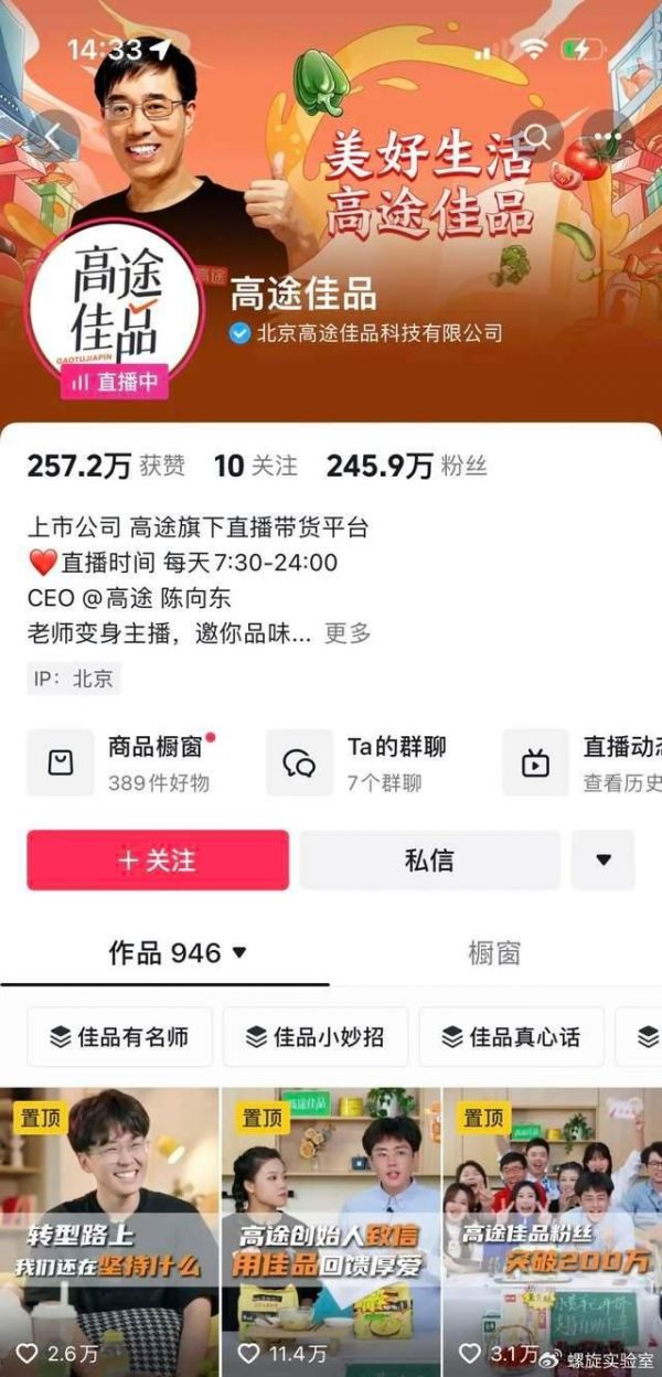 截至发稿时,高途佳品的抖音账号已经突破240万粉丝,在整个东方甄选“小作文”风波中,涨粉超过200万。创始人陈向东的抖音粉丝数量也突破了420万。