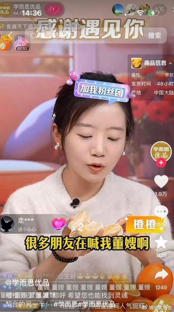 另一家转型中的教培机构学而思,旗下的“学而思优品”直播间人数也在近期暴涨百倍,其直播间女主播“橙橙”因直播风格与董宇辉相近,更是被董宇辉的“丈母娘”们戏称为“董嫂”。