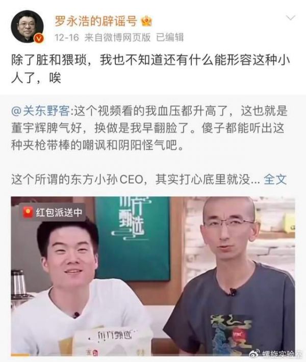 比如他在网络上怒斥东方甄选原CEO孙东旭为“脏和猥琐的小人”,在直播时称呼俞敏洪为“铁公鸡”,炮轰东方甄选可能是“最不公平、最荒唐、最欺负压榨年轻人的现象级公司”,还把俞敏洪和董宇辉的合体直播称作“史上最大规模的职场PUA直播现场”。