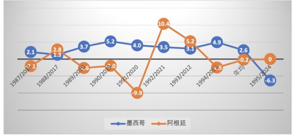 前面提到,龙舌兰效应出现之前,在经济调整尤其是在北美自贸协定的加持之下,墨西哥经济已经连续8年处于增长轨道,年均2.6%。与此形成反差的是,在2016~2023年的8年期间,阿根廷经济增长在一半多(5年)的时间内为负值,特别是2020年, 在新冠疫情的打击下,更是达到-9.9%,年均为-0.2%(图3)。