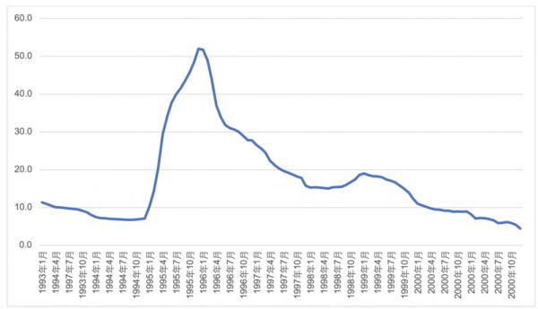 图2:墨西哥通胀水平年度变化(%)(1993年1月~2000年12月)