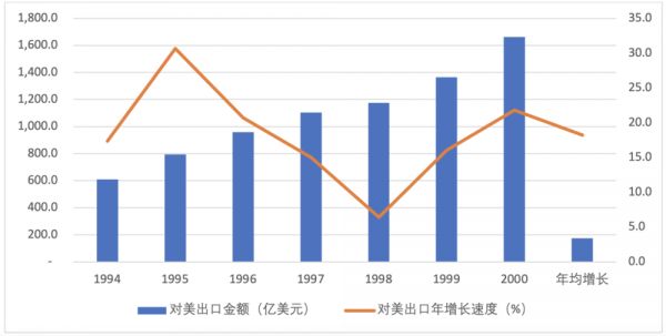 图4:1994~2000年墨西哥对美出口金额与年增长速度(亿美元、%)