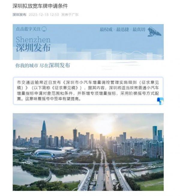 近日,深圳市交通运输局发布《深圳市小汽车增量调控管理实施细则(征求意见稿)》(以下简称《意见稿》)。根据其内容,深圳将适当放宽普通小汽车增量指标申请对象范围和条件,并新增专项增量指标,采用阶梯摇号方式配置,即摇号越久,中签率就越有望提高。