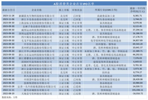 目前,A股还有不少正在排队的消费类企业,包括食品制造业企业幺麻子食品和认养一头牛,饮料和精制茶制造业企业菊乐股份、鲜活饮品、德馨食品、中国茶叶、天地壹号,家居家装类企业远超智慧、时代装饰、金标股份等。