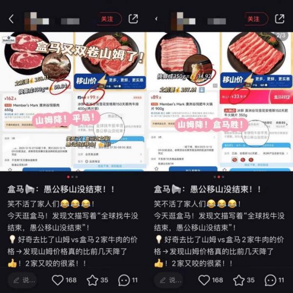 “全球找牛没结束”“愚公移山没结束”,近日,有用户登陆盒马APP在一款牛肉下方发现了这样的文字描述,再度剑指山姆——同盒马曾针锋相对的榴莲蛋糕一样,牛肉也是山姆的代表商品之一。