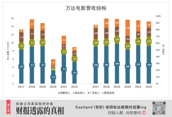 万达电影营收分为四大类:观影(即电影放映)、商品销售(爆米花等)、广告、影视游戏(影视投资、制作、发行,网络游戏发行与运营)。