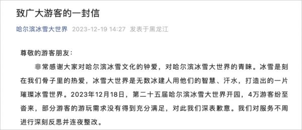 第二天,哈尔滨冰雪大世界发布致歉信,称会连夜整改。20日,游玩项目的“分时预约”制被取消,实行现场排队、先到先玩。