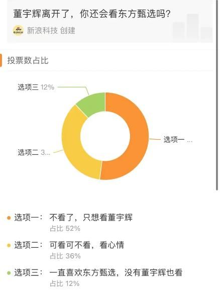 新浪科技发布了一份千余人参与的投票显示,有占比52%的网友表示只想看董宇辉,如果董宇辉离开东方甄选就不会再看东方甄选的直播间;另有36%的消费者表示“可看可不看”,只有12%的人表示自己一直喜欢东方甄选,没有董宇辉也会看。