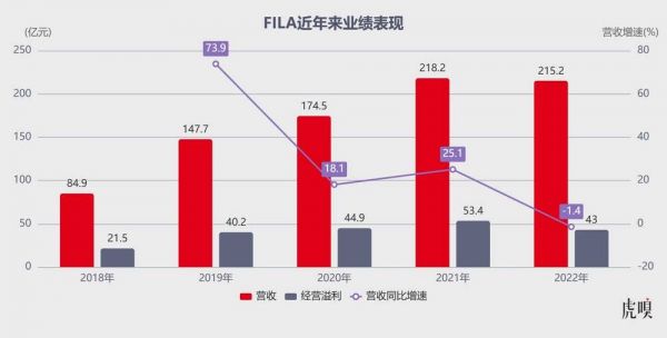 2022年,FILA实现营收215亿元,同比下滑了1.4个百分点。这还是连续增长10多年后,FILA首次出现业绩下滑的情况……