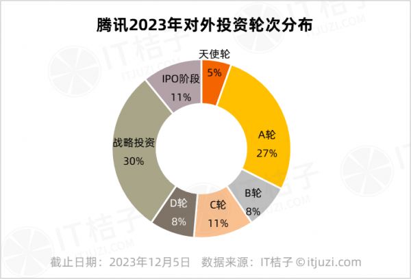 从参与轮次分布来看,今年出手的投资交易中,腾讯以战略投资和 A 轮为主要轮次,分别占 30%、27%,在 B~D 轮之间的事件也有 27%。在天使轮,腾讯很少涉及,今年其仅参与了对王小川所创立“百川智能”的天使投资。