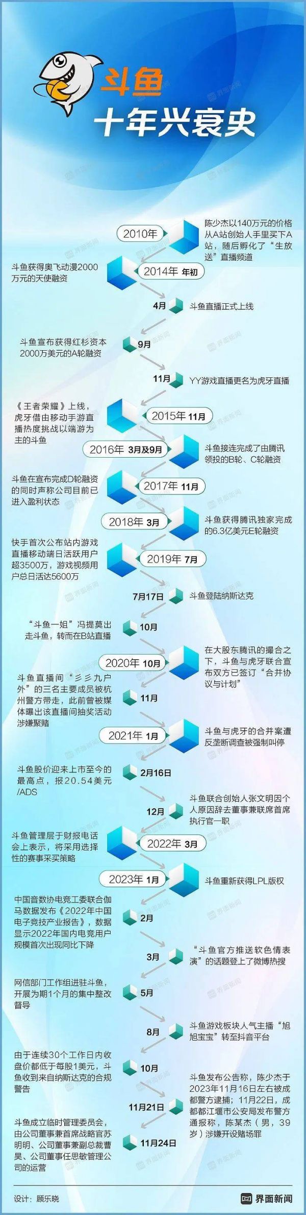 2023年11月22日,成都都江堰警方发布警情通报称,陈某杰涉嫌开设赌场罪,目前已被依法执行逮捕,案件正在进一步侦办中。随后,斗鱼也发布公告提示投资者,陈少杰的持续被拘留以及随后针对相关方的任何相关法律诉讼和执法行动可能会对公司的声誉、业务和经营业绩产生重大不利影响。