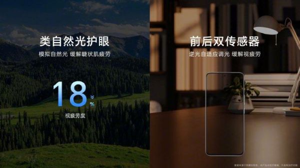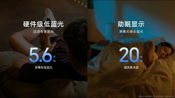 此外手机搭载“类自然光护眼功能”,据称可“降低 18% 视觉疲劳”,还配备了“硬件级低蓝光”及“助眠显示功能”,号称能够降低 5.6% 屏幕有害蓝光,提升用户 20% 褪黑素浓度。