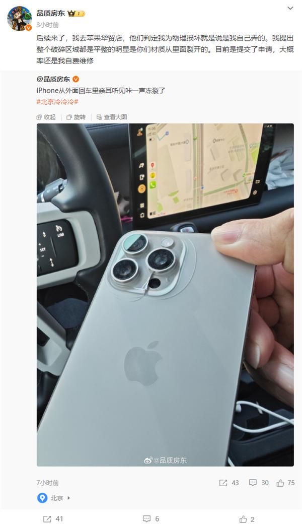 快科技12月20日消息,今日,微博博主“品质房东”发文称,“iPhone从外面回车里亲耳听见咔一声冻裂了”。