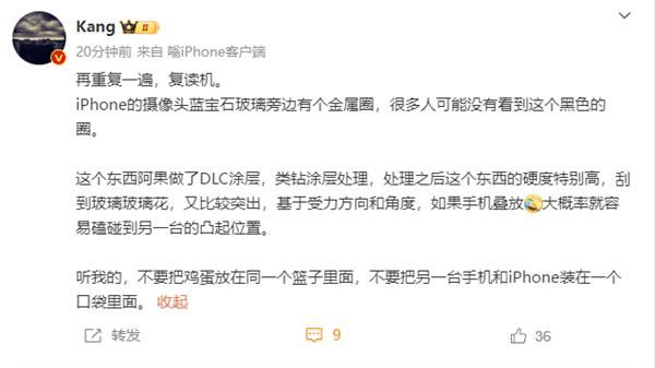 “Kang”表示,这个黑色的圈苹果做了DLC涂层,类钻涂层处理,处理之后硬度特别高,刮到玻璃玻璃花,又比较突出,基于受力方向和角度,如果手机叠放,大概率就容易磕碰到另一台的凸起位置。