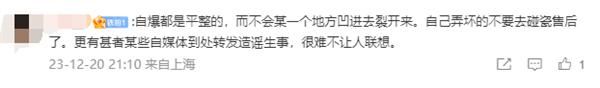 对此,有网友表示:“明显是磕到什么硬的东西了,镜头下面这么明显的外力点”“自爆都是平整的,而不会某一个地方凹进去裂开来,自己弄坏的不要去碰瓷售后了。”