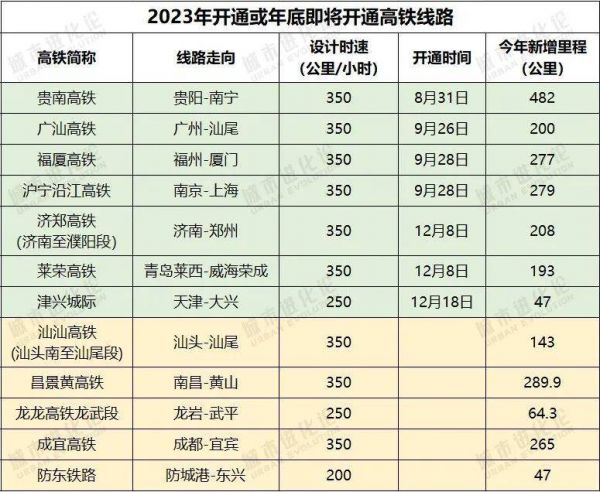 据城叔不完全统计,另有5条高铁进入开通倒计时,有望在年底前冲关,包括汕汕高铁、昌景黄高铁、龙龙高铁龙武段、成宜高铁和防东铁路,预计合计新增高铁里程超800公里。