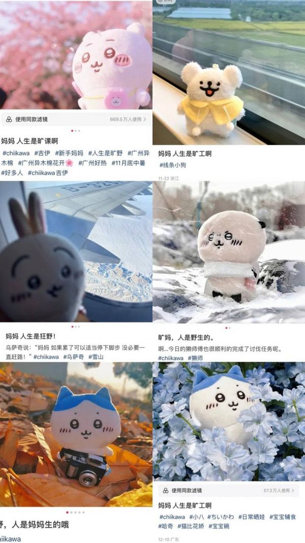 一时间,小红书上出现了一系列“旷野文学”的新创作,萌萌的吉伊卡哇(Chiikawa)或是马尔济斯小狗玩偶天真乖巧地伫立在皑皑白雪、金黄的银杏树林、前往旅途的高铁橱窗等景色中,说着让人摸不着头脑的俏皮话。