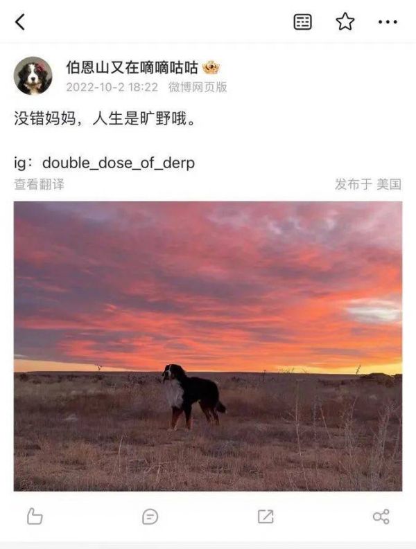 而旷野文学被广为流传开来的契机,是伯恩山犬bot的之前的一条置顶微博。这条微博的图片是一只伯恩山犬站在空旷的原野上,背后是夕阳的余晖将天空晕染成橙色的画卷,彰显着生命的无限自由。