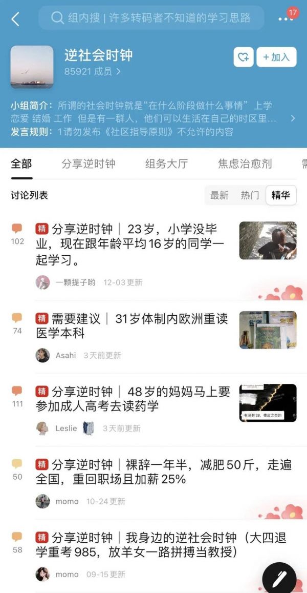 豆瓣有一个逆社会时钟小组,聚集了八万多的成员,这里是时间逆行者的集结地。48岁的妈妈参加成人高考读药学、35岁去德国读研究生、36岁还在读本科······他们分享彼此的逆时钟人生,正在或即将展开一场逆社会时钟的旅行。