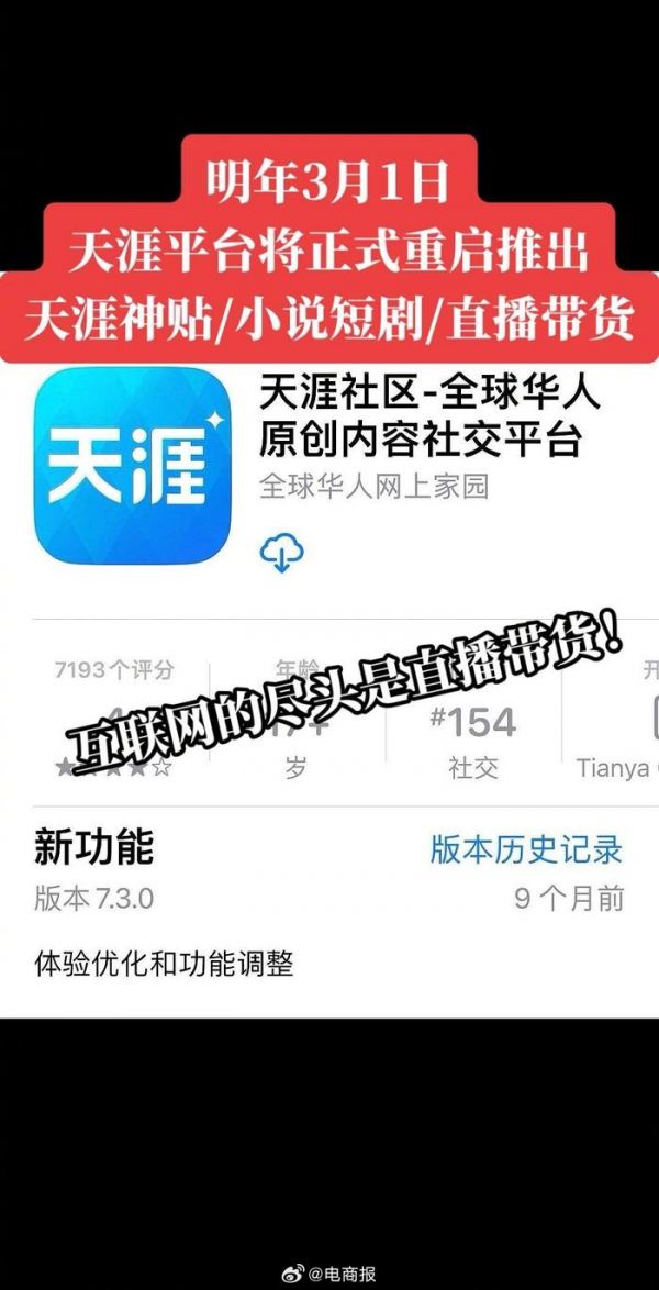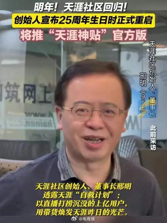 #天涯创始人称明年重启# 天涯创始人称明年重启,将推官方直播和天涯神贴,围绕直播业务与电商战略。