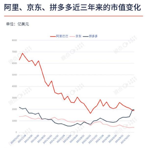 阿里、京东、拼多多近三年市值变化图源:晚点LatePost官微