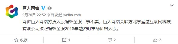 9月20日晚间,巨人网络在官方微博上发文表示,网传巨人网络打折入股蚂蚁金服一事不实,巨人网络关联方北京盈溢互联网科技有限公司按照蚂蚁金服2018年融资时市场价格入股。