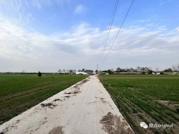 施工现场,正在修建的路段穿过了原本的农田。附近,一条小溪在枫杨树的包围下静静流淌,远处的土地清冷空旷。