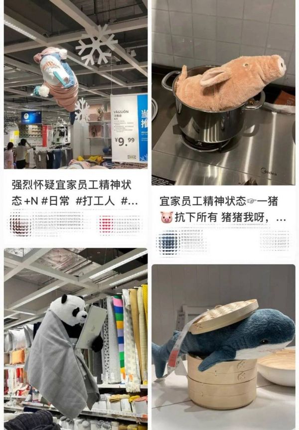 丑萌的宜家玩偶,被员工们摆放成了在发疯边缘反复试探的样子,然后在小红书出圈。