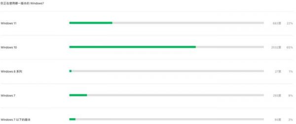 聚焦到国内用户,Windows 10 的使用率也不低。就在本月初,CSDN 发起过一项关于 Windows 版本的使用投票。根据数据显示,Windows 10 的使用率依然高票排名第一,占比 65%,Windows 11 用户量仅占比 22%。
