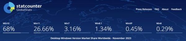 现如今,放眼全球,据 Statcounter 数据显示,Windows 10 的使用率高达 68%,远远超过 Windows 11 的使用量。