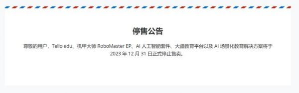 IT之家 12 月 22 日消息,大疆教育应用官网发布公告,Tello edu、机甲大师 RoboMaster EP、AI 人工智能套件、大疆教育平台以及 AI 场景化教育解决方案将于 2023 年 12 月 31 日正式停止售卖。