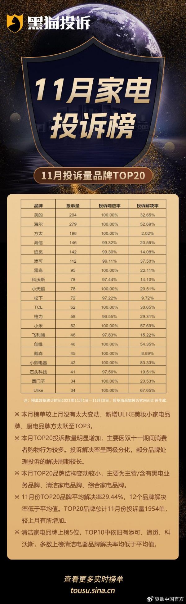 2023年12月22日黑猫投诉发布了11月黑猫平台家电投诉榜,可以看到,黑猫投诉平台家电投诉量TOP20品牌较上月统计榜单没有太大变动, TOP20品牌结构变动较小,主要为主营/含有黑电业务品牌、清洁家电品牌、综合家电品牌。