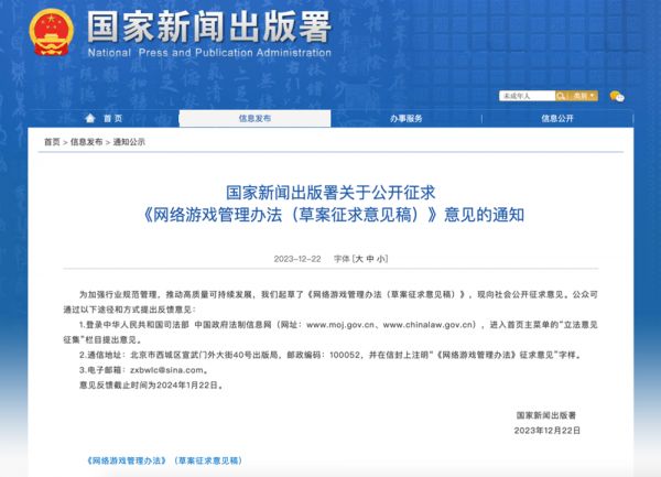 2023年12月22日,国家新闻出版署发布通知,公开征求《网络游戏管理办法(草案征求意见稿)》意见(下称《意见》,全文见https://www.nppa.gov.cn/xxfb/tzgs/202312/t20231221_823187.html)。国家新闻出版署表示,这是为加强行业规范管理,推动高质量可持续发展。