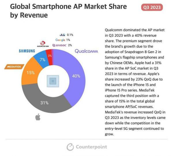 高通在 2023 年第三季度以 40% 的收入份额主导了 AP 市场。由于三星旗舰智能手机和中国原始设备制造商采用骁龙 8 Gen 2,高端细分市场推动了该品牌的增长。