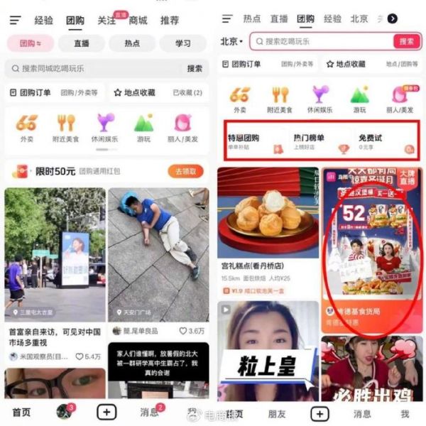 近期,抖音还对团购进行了新一轮调整。抖音APP团购首页新增“特惠团购”、“热门榜单”、“免费试”三大模块,且位置就在外卖入口下方。直播间也放在了更前排进行推流。