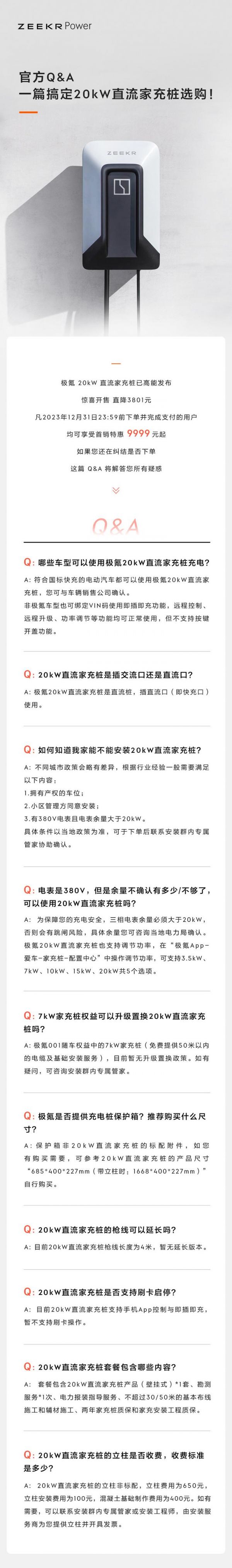 极氪20kW直流家充桩首销9999元起,非极氪车型可使用大部分功能