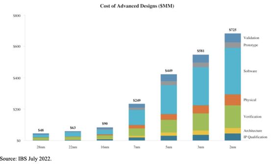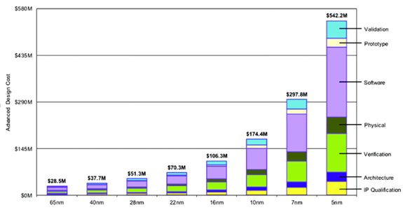 正因为拥有如此多步骤,可以预见芯片设计过程中需要涉及多少的工具和软件之前,IBS有一张图广为流行。如下图所示,它展示了不同节点下生产一颗新芯片的成本。从这个图中我们可以看到,芯片设计成本不但包括了各种IP的授权费用,还包括了软件和验证带来的支出。如图所示,在5nm的时候,芯片的设计成本已经高达5.4亿美元。