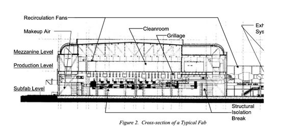 首先看建厂方面,一般而言,晶圆厂的建筑负责保护芯片产线免受周围环境的影响。晶圆厂的核心是洁净室,里面装有生产新芯片的机器。晶圆厂的其余部分负责尽可能地将洁净室与外界环境隔离。下图提供了铸造厂的横截面图。请注意,因为我们需要大量的结构隔离工作来稳定包含洁净室的生产水平,所以这部分的建设工作最终可能成为整个主体结构中最昂贵的部分。